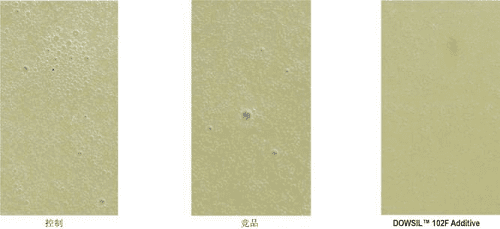 實(shí)驗(yàn)2,有一組對(duì)照組,兩組實(shí)驗(yàn)組,這兩組實(shí)驗(yàn)組分別添加道康寧102F消泡劑、其它品牌消泡劑,在含交聯(lián)劑和稀釋劑的環(huán)氧防護(hù)底漆中添加0.4%含量的消泡劑,在在 1500 轉(zhuǎn)/分的速度下,高速攪拌機(jī)剪切15分鐘后,將等量的油漆倒入扁平的容器中,等待油漆固化,固化后的表面性狀顯示道康寧102F消泡劑的性能要強(qiáng)于其它品牌的消泡劑,采用道康寧102F消泡劑的環(huán)氧防護(hù)底漆中的表面氣泡更少。